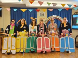 Este año la temática se centra en los Guateques de los años 70 – 80, y por tanto hemos propuesto realizar unos originales collares, unas gafas divertidas y unos cinturones para complementar el disfraz que ellos han diseñado y elaborado.